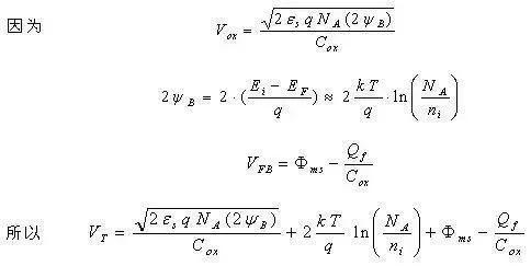 在閾值電壓的表示式中,與摻雜濃度和溫度有關的因素主要是半導體Fermi勢ψB。當p型半導體襯底的摻雜濃度NA提高時,半導體Fermi能級趨向于價帶頂變化,則半導體Fermi勢ψB增大,從而就使得更加難以達到ψs≥2ψB的反型層產生條件,所以閾值電壓增大。