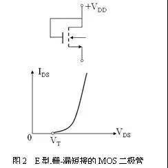 【答】這種集成MOS二極管的連接方式及其伏安特性如圖2所示。因為柵極與漏極短接,則VGS=VDS。因此,當電壓較小(VGS=VDS<VT)時,不會出現(xiàn)溝道,則器件處于截止狀態(tài),輸出電流IDS=0;當電壓高于閾值電壓(VGS=VDS≥VT)時,因為總滿足VDS>(VGS-VT)關(guān)系,于是出現(xiàn)了溝道、但總是被夾斷的,所以器件處于飽和狀態(tài),輸出源-漏電流最大、并且飽和,為恒流源。