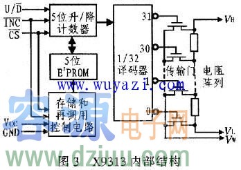 2個頂腳引線分別接VH和VL,中間抽頭為VW。為3個控制端,其中,為片選端,為低電平時,X9313被選中。此時才能接收的信號。在下降沿使計數器增或減1。如果,滑動端向VH方向滑動,VW與VH之間的電阻減小一個階值。反之,如果,滑動端向VL方向滑動。計數器輸出譯碼后,經過32選1,使滑動端的位置沿電阻陣列移動。當計數器達到某個極端(00000或11111)時,不會循環回復,從00000自動變成1111l,或從11111變成00000,也就是說當為高電平而也為高電平時,計數器的值存儲到非易失存儲器中,系統上電時,器件自動將非易失性存儲器中的值送到計數器,作為計數器的輸出。