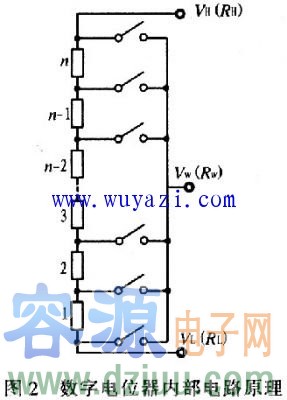 由于數字電位器可代替機械式電位器,所以二者在原理上有相似之處。數字電位器屬于集成化的三端可變電阻器件其等效電路,如圖l所示。當數字電位器用作分壓器時,其高端、低端、滑動端分別用VH、VL、VW表示;而用作可調電阻器時,分別用RH、RL和RW表示。