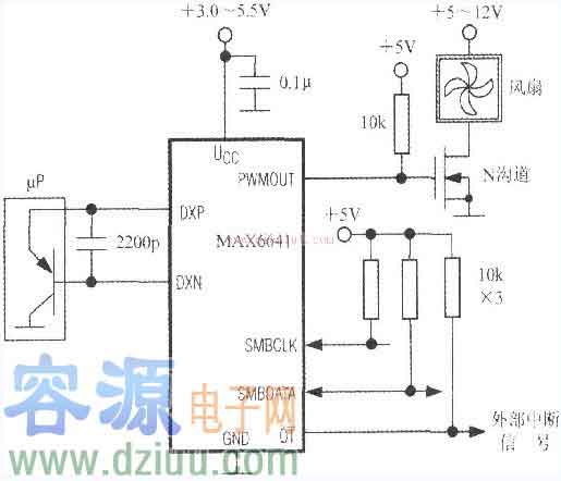 MAX6641的典型應用電路如圖所示。這里是用PWMOUT端來驅動N溝道MOSFET,進而控制風扇轉速的。遠程PN結溫度傳感器可用微處理器(μP)內部測溫三極管的發射結來代替。亦可選用CMPT3906、T3