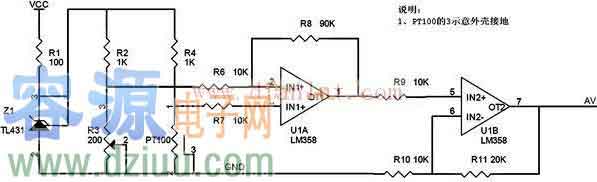如圖所示為Pt100溫度傳感器電路圖。 放大電路采用LM358集成運算放大器,為了防止單級放大倍數過高帶來的非線性誤差,放大電路采用兩級放大,如圖所示,前一級約為10倍,后一級約為3倍