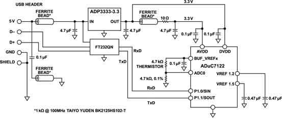 使用模擬MCU,LDO,外部熱敏電阻和一些分立器件,您可以構建高精度的溫度傳感應用。圖1中的電路顯示了Analog DevicesADuC7122精密模擬微控制器的工作原理可用于精確的熱敏電