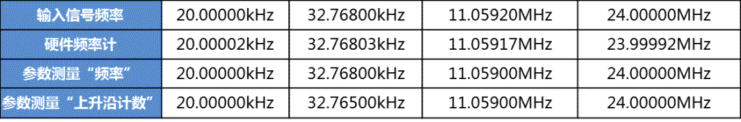 可見三者測量結果差異不大,硬件頻率計的分辨率更高,而參數測量中有效位數只有5位。此信號發生器輸出頻率的準確度為±1ppm,示波器內部晶振的頻率準確度為±2ppm,在上述的24MHz硬件頻率計中,測量的準確度為80Hz/24MHz=3.33ppm,基本在儀器的測量精度內。參數測量值在某些情況下顯得更接近真實值,這是因為其有效位數不夠而四舍五入的原因,準確度更高的還是硬件頻率計。
