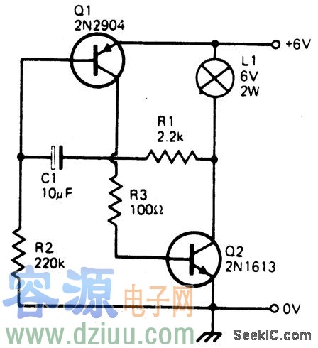 這個簡單的電路將會在6V的燈泡上閃爍,它的發(fā)光率是由電容器C1的尺寸所決定的。這是最經濟的電源,因為只有當電燈開啟的時候它才吸收電流。當燈關閉時,兩個晶體管就偏置關閉了。 :