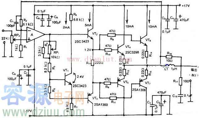 電路中運放的作用是電壓放大,晶體管VT1~VT7用于電流放大,VT1用來調整偏置電壓。 調試方法:本電路工作于AB類狀態(tài),在靜態(tài)時調整RP1使VT4~VT7的靜態(tài)電流各為10MA即可。 :