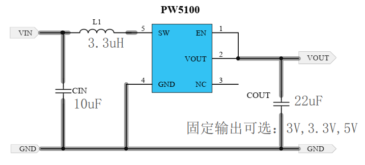 PW5100 的工作頻率高達(dá) 1.2MHz,其目的是為了能夠減小外部的電感尺寸和輸出電容容值,故 PW5100 只需要 1uH 以上的電感就可以保證正常工作,