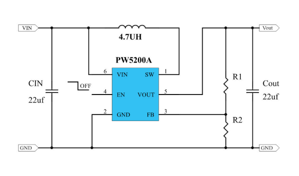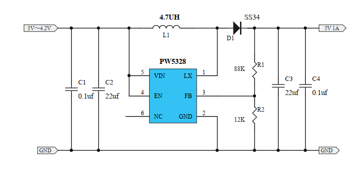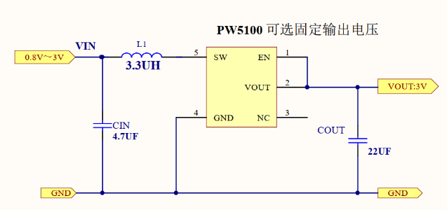 PW5328B輸入電壓2V-24V,可以滿足2V升3V輸出1A的設計要求。