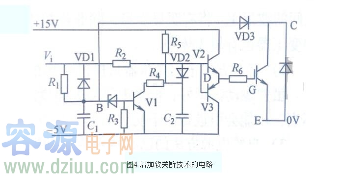 在圖2所示驅動保護二合一電路基礎上增加軟關斷技術的驅動電路如圖4所示。