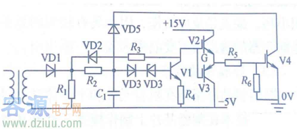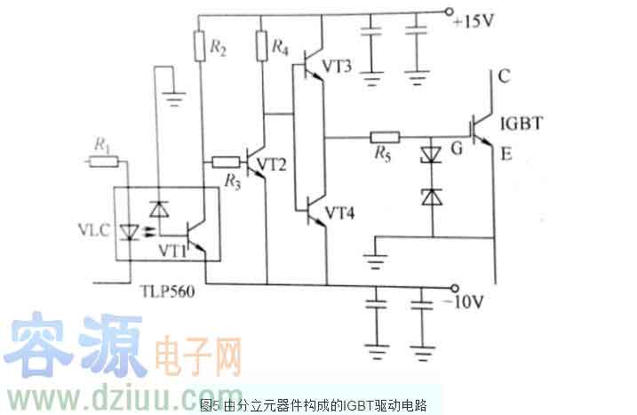 圖5所示驅動電路為采用光耦合器等分立元器件構成的IGBT驅動電路。當輸入控制信號時,光耦合器VLC導通,晶體管V2截止,V3導通輸出+15V驅動電壓。當輸入控制信號為零時,VLC截止,V2、Ⅵ導通,輸出-10V電壓。+15V和-10V電源需靠近驅動電路,驅動電路輸出端及電源地端至IGBT柵極和發射極的引線應采用雙絞線,長度最好不超過0.5m。在IGBT驅動電路設計時應注意以下幾點: