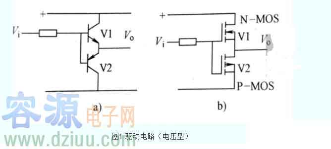 圖1a所示的驅動電路適合于驅動低頻小功率IGBT,當控制信號Vi為高電平時,Vl導通,輸出Vo對應控制的開關管(IGBT)導通;當控制信號Vi為低電平時,V2導通,輸出Vo對應控制的開關管(IGBT)被關斷。