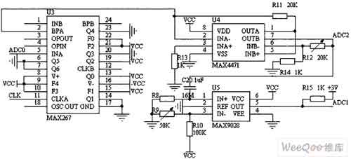 如下圖所示,電路由濾波和放大兩部分組成。其中MAX267是MAXIM公司出產的一個集成濾波器,可以構成低通、帶通、高通、等多種方式,使用靈活,性能遠遠優于采用集成運放組成的濾波電路。