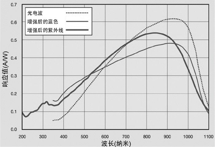 普通成像傳感器采用CCD、CMOS、BSI和Foveon方法進(jìn)行制造。硅制圖像傳感器具有一個(gè)非線性的光譜響應(yīng)曲線,這會(huì)很好地感知光譜的近紅外部分,但對(duì)藍(lán)色、紫色和近紫外部分就感知得不好(如圖2所示)。