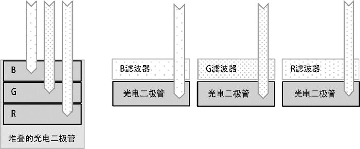 圖4:(左圖)堆疊RGB元件的Foveon方法:在每個(gè)元件位置都有RGB顏色, 并在不同的深度吸收不同的波長(zhǎng);(右圖)標(biāo)準(zhǔn)的馬賽克元件:在每個(gè)光電二極管上面放置一個(gè)RGB濾波器,每個(gè)濾波器只允許特定的波長(zhǎng)穿過(guò)每個(gè)光電二極管