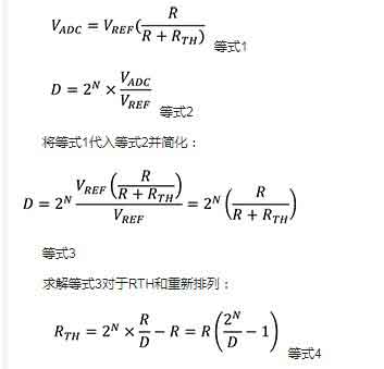 圖2中的電路設(shè)置為分壓器配置。這將允許我們使用以下公式將ADC結(jié)果D轉(zhuǎn)換為RTH(熱敏電阻)電阻的測(cè)量值: