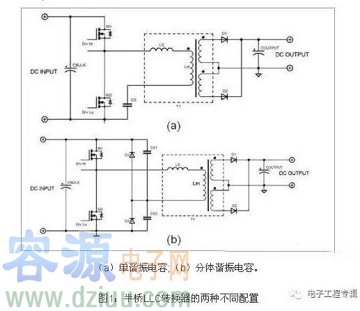單諧振電容和分體諧振電容都存在于半橋轉換器當中。對于單諧振電容配置而言,它的輸入電流紋波和均方根(RMS)值較高,而且流經諧振電容的均方根流較大。這種方案需要耐高壓(600~1,500V)的諧振電容。不過,這種方案也存在尺寸小、布線簡單等優點。