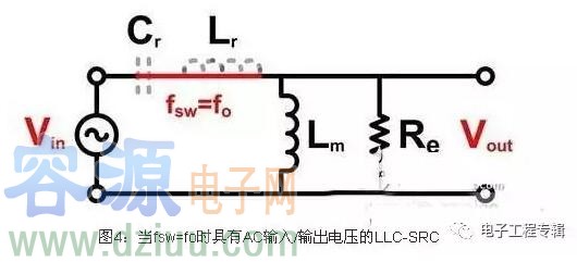 任何時候,在Mg/fn圖表中fn_min都需要高于增益曲線的脊線。這是為確保金屬氧化物半導體場效應晶體管(MOSFET)能保持ZVS狀態。LLC-SRC的效率只能在一個操作點進行優化。當fsw= fo時,串聯Lr和Cr變成零阻抗狀態(圖4);該轉換器在那個點具有最高的效率。您需要決定自己想優化的線路/負載條件,并確保您的開關頻率在那樣的條件下是諧振頻率。