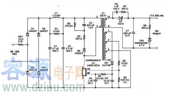 二極管D7對次級進行整流,C7對其進行濾波。C6和R7可以共同限制D7上的瞬態電壓尖峰,并降低傳導及輻射EMI。電阻R8和齊納二極管 VR1形成一個輸出假負載,可以確保空載時的輸出電壓處于可接受的限制范圍內,并確保充電器從AC市電斷開時電池不會完全放電。反饋電阻R5和R6設定最大工作頻率與恒壓階段的輸出電壓。