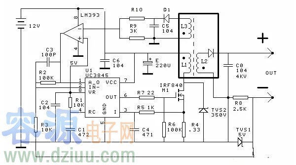 研制儀器需要一個能在0到3兆歐姆電阻上產生1MA電流的恒流源,用UC3845結合12V蓄電池設計了一個,變壓器采用彩色電視機高壓包,其中L1用漆包線在原高壓包磁心上繞24匝,L3借助原來高壓包的一個線圈,L2借助高壓包的高壓部分。L3和LM393構成限壓電路,限制輸出電壓過高,調節R10 可以調節開路輸出電壓。