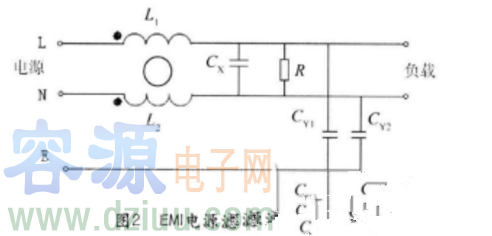 圖中Cx是差模電容器,一般稱為X電容,電容量宜選為0.01-2.22μF,CY1和CY2是共模電容器,一般稱為Y電容,電容量約為幾納法(nF)到幾十納法。C3和C4的電容量不宜選得過大,否則容易引起濾波器甚至機殼漏電的危險。L為共模扼流圈,它為同向繞在同一個鐵氧體環上的一對線圈,電感量約為幾毫亨(mH)。對于共模干擾電流,兩個線圈產生的磁場是同方向的,共模扼流圈表現出較大的阻抗,從而起到衰減干擾信號的作用;而對于差模信號(在這里是低頻電源電流),兩個線圈產生的磁場抵消,所以不影響電路的電源傳輸功能。