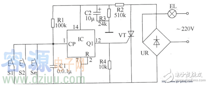 本例介紹一款具有延時(shí)功能的多地控制開關(guān),采用多只按鈕來控制一路照明燈。按動(dòng)任一只按鈕,均可使照明燈點(diǎn)亮,3min左右照明燈自動(dòng)" />