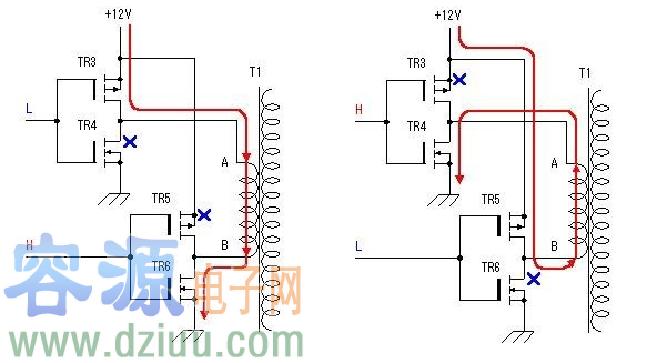由于方波信號發生器輸出的振蕩信號電壓最大振幅為0~5V,為充分驅動電源開關電路,這里用TR1、TR2將振蕩信號電壓放大至0~12V。
