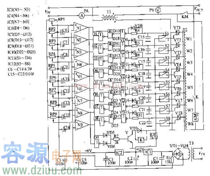本例介紹一款補償式無觸頭交流全自動穩(wěn)壓器,它采用控制變壓器一次電壓來改變二次補償電壓,解決了線路調壓瞬間斷電現象。該交流穩(wěn)壓器的輸人電壓為交流167-264V,輸出電壓為交流220(1土5%)V。