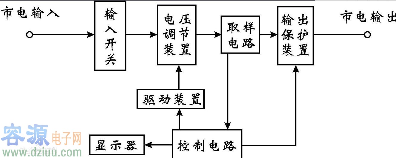 交流穩(wěn)壓器種類固然很多,主回路工作原理有所不同,但基本上(交流參數穩(wěn)壓器例外)基本都是輸入開關取樣電路,控制電路,電壓調節(jié)裝置,輸出保護裝置,驅動裝置,顯示器及及組成,其基本工作原理框圖如下: