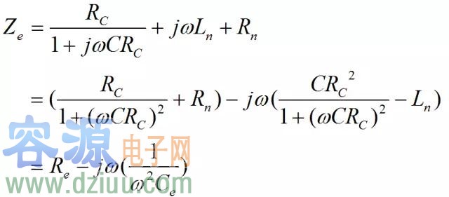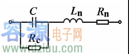 在交流下電容元件總有一定介質損耗,此外其引線也有一定電阻Rn和分布電感Ln,因此電容元件等效電路如圖 3所示。圖中C是元件的固有電容,Rc是介質損耗的等效電阻。等效阻抗為