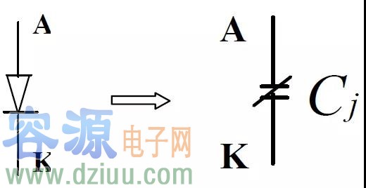 二極管反向截止時可用一電容等效,其容量與所加的反向電壓、環境溫度等有關,大小可從制造商的手冊中獲得。