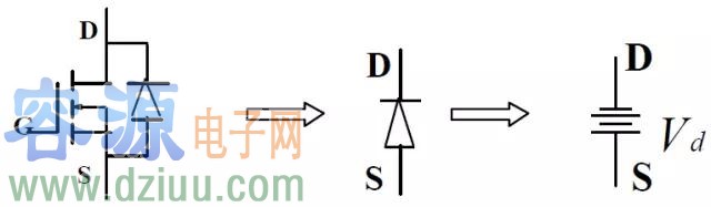 即內部二極管的等效電路,可用一電壓降等效,此二極管為MOSFET 的體二極管,多數情況下,因其特性很差,要避免使用。