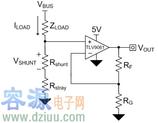 精確的低側電流感應設計對印刷電路板的設計有兩大要求。首先要確保分流電阻(Rshunt)直接連接到放大器的同相輸入端和RG的接地端,這通常被稱為“開爾文接法”(Kelvin connection)。如果不使用開爾文接法,會產生與分流電阻(Rshunt)串聯的寄生電阻,導致系統產生增益誤差。圖2顯示了系統中寄生電阻的位置。