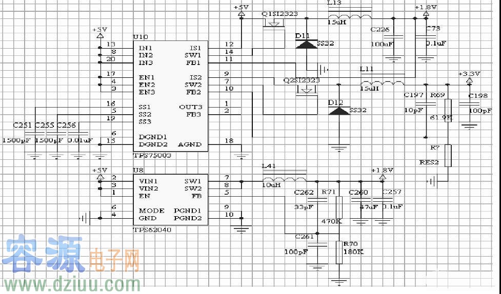 系統(tǒng)電源分為+5V、+3.3V、+1.8V、+1.2V 四種,系統(tǒng)主供電電源為+5V,其余均由+5V 電源供給。因此,采用一片TPS75003 和一片TPS62040 完成系統(tǒng)四種電源的轉換。設計用TPS75003 的SW1 引腳經過SI2323 續(xù)流整形后輸出1.2V 電壓用于DM6446 內核供電,IS1 引腳連接參考電壓,F(xiàn)B1 引腳接輸出1.2V 電壓作為反饋,SW2 引腳輸出3.3V 電壓用于DM6446 外設接口供電。TPS62040 的SW1 和SW2 引腳短接后輸出1.8V 電壓用于DM6446 存儲器接口供電,F(xiàn)B 引腳連接1.8V 作為反饋輸入。這樣,用一片TPS75003 和TPS62040 電源管理芯片就可以滿足本系統(tǒng)供電。TPS75003 和TPS62040電源轉換電路如圖1所示。