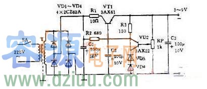 圖3是一個實用的穩壓電源。輸出電壓3~9伏可調,輸出電流最大100毫安。這個電路就是串聯型穩壓電源電路。要注意的是: