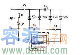 圖2是利用倍壓整流原理得到小電流直流高壓電的滅蚊蠅器。220伏交流經過四倍壓整流后輸出電壓可達1100伏,把這個直流高壓加到平行的金屬絲網上。網下放誘餌,當蒼蠅停在網上時造成短路,電容器上的高壓通過蒼蠅身體放電把蠅擊斃。蒼蠅尸體落下后,電容器又被充電,電網又恢復高壓。這個高壓電網電流很小,因此對人無害。