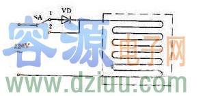圖1是一個電熱毯電路。開關在“1”的位置是低溫檔。220伏市電經二極管后接到電熱毯,因為是半波整流,電熱毯兩端所加的是約100伏的脈動直流電,發熱不高,所以是保溫或低溫狀態。開關扳到“2”的位置,220伏市電直接接到電熱毯上,所以是高溫檔。