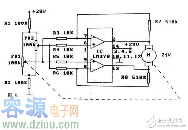 圖9采用功率型運放驅(qū)動電機,屬橋式驅(qū)動電路,控制信號從R1,R2,RP1, RP2組成的惠斯登電橋臂上得到,若RP2用于信號的檢測,電機對RP1進行反饋跟蹤調(diào)節(jié),則可實現(xiàn)誤差比例控制,這里LM378可提供最大達1A的驅(qū)動電流,本電路在伺服系統(tǒng)中具有廣泛的應用。