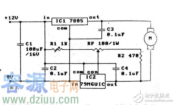用集成電路驅(qū)動電機的情況也較多,和一般的三端穩(wěn)壓器直接驅(qū)動不同,圖8電路使電機可以獲得從0V至7V的驅(qū)動電壓,因而具有低壓調(diào)速性能,IC1為 正輸出的固定穩(wěn)壓器,IC2為可調(diào)負輸出的四端穩(wěn)壓器,調(diào)節(jié)R1可以使電機獲得零電壓,由于IC2的散熱片內(nèi)部與輸入端相連,因此IC1, IC2可用公共散熱器,以適應低壓工作。