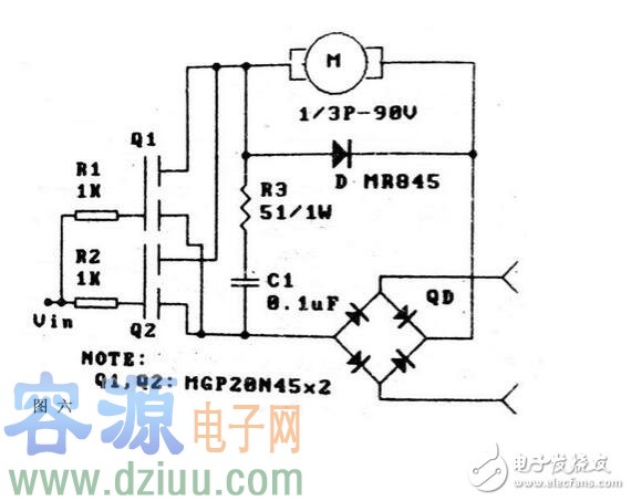 因電機對供電穩(wěn)定的要求并不高,圖6的驅(qū)動電路不失為一種交流供電方案,交流電經(jīng)全橋整流后,驅(qū)動并聯(lián)使用的MOS場效應管Q1、Q2,R3、C1起濾波作用;續(xù)流二極管D用以防止高電壓對Q1、Q2的破壞。