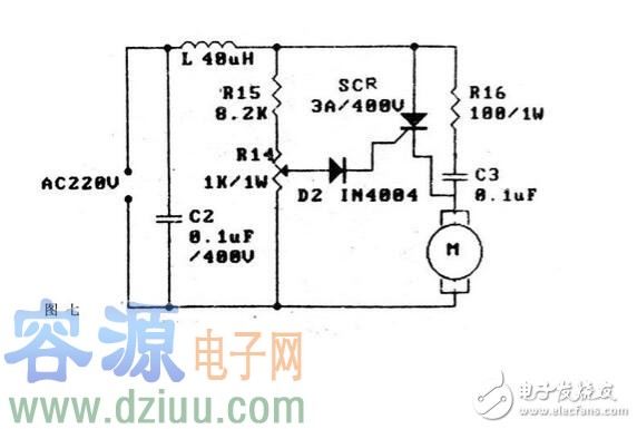 圖7利用可控硅的整流特性驅(qū)動直流電機,本電路僅適用于小功率電機調(diào)速,R2,C3的濾波網(wǎng)絡可以吸收電機的反電動勢保護SCR,C2與L組成的濾波器,能抑制電網(wǎng)干擾。