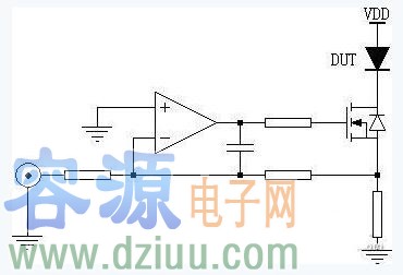 運放組成基本的反向運算電路,驅(qū)動vdmos管的柵極,漏源電流通過vdmos管源極取樣電阻,加到運放反向輸入端,與輸入波形相加形成反饋,運放輸出電壓控制vdmos管的柵極電壓vgs,進(jìn)而控制漏極輸出電流ids[3]。這個ids就是施加給待測二極管(dut)的正向浪涌電流。