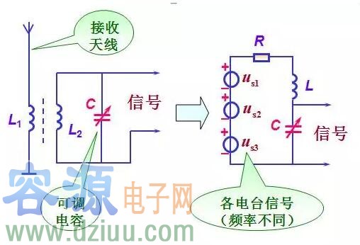 在收音機中,常利用串聯諧振電路來選擇電臺信號,這個過程叫做調諧,下圖即為其典型電路。