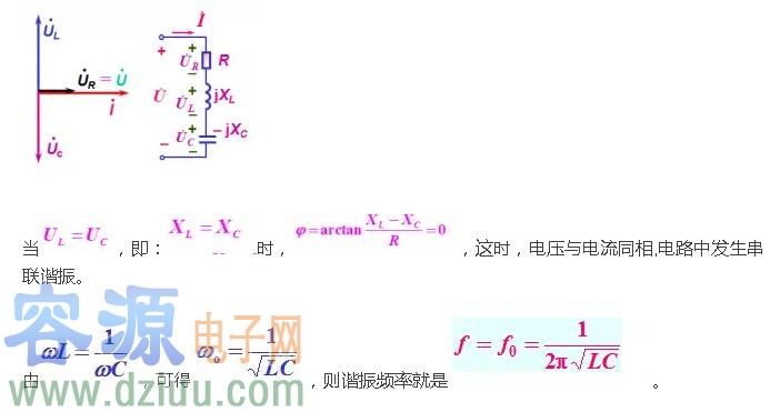 在電阻、電感及電容所組成的串聯電路內,當容抗XC與感抗XL相等時,即XC=XL,電路中的電壓U與電流I的相位相同,電路呈現純電阻性,這種現象叫串聯諧振。當電路發生串聯諧振時電路中總阻抗最小,電流將達到最大值。