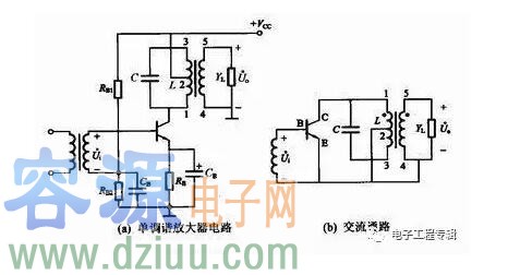 上圖中,LC并聯諧振回路作為晶體管集電極負載,它調諧于放大器的中心頻率。在聯接方式上,LC回路通過自耦變壓器與本級集電極電路進行聯接,與下一級的聯接則采用變壓器耦合。