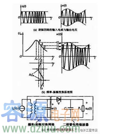 以斜率鑒頻器為例,如圖所示,圖(a)是諧振回路的輸入電流與輸出電壓。圖(b)是其中的頻率一振幅變換原理。圖(c)為單失諧回路鑒頻器原理圖。