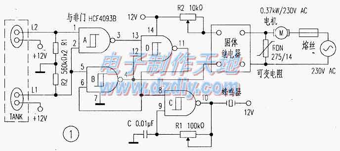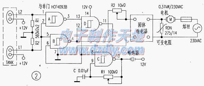 當水箱為空時,傳感器L1與L2和門D都為低電平,因為門B和A的輸出為高。當水位上升,將+12v通過L1短接時,門的輸出保持不變。當水位再升高,+12v通過L2短接時,門A的輸出變為低.使門D達到高電平。這一動作將門B的輸出鎖存為低。門B的輸出低電平拉低了SSR(固態繼電器),從而啟動水泵。同時,門D的高輸出電平啟動了門控的振蕩器,使壓電蜂鳴器發聲。