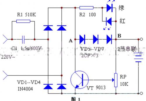 工作原理:電路原理見圖 1(電容 C1、二極管 VD1-VD4 構(gòu)成降壓(限流)、整流電路。由于電容的內(nèi)阻很大,則輸出近似為恒流,經(jīng)二極管 VD5-VD7 給電池充電,并在 VD5-VD7 上產(chǎn)生約 2.1V 的電壓降使發(fā)光二極管發(fā)光(綠色),作為充電指示。三極管 VT 和電位器 RP 組成自動保護(hù)電路。當(dāng)電池充滿后,VT 飽和導(dǎo)通,自動切斷充電電流。同時 A 點電位下降至 0.5V 左右,這時,VB>VA,使紅色發(fā)光二極管發(fā)光,表示充電結(jié)束。