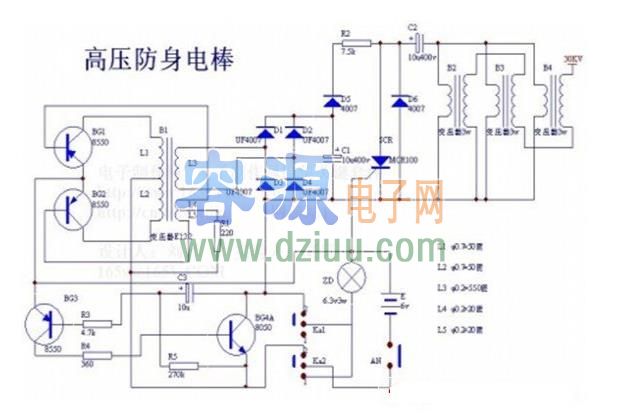 高壓防身電棒電路原理:BG1、BG2、B1構(gòu)成交、直流變換