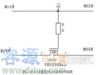 圖3利用了MOS管的開關特性,控制電路的導通和斷開來設計防反接保護電路,由于功率MOS管的內阻很小,現在 MOSFET Rds(on)已經能夠做到毫歐級,解決了現有采用二極管電源防反接方案存在的壓降和功耗過大的問題。極性反接保護將保護用場效應管與被保護電路串聯連接。保護用場效應管為PMOS場效應管或NMOS場效應管。若為PMOS,其柵極和源極分別連接被保護電路的接地端和電源端,其漏極連接被保護電路中PMOS元件的襯底。若是NMOS,其柵極和源極分別連接被保護電路的電源端和接地端,其漏極連接被保護電路中NMOS元件的襯底。一旦被保護電路的電源極性反接,保護用場效應管會形成斷路,防止電流燒毀電路中的場效應管元件,保護整體電路。具體N溝道MOS管防反接保護電路電路如圖3示。