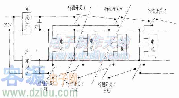 此裝置的電路如附圖所示! ∫、工作原理 1.當定時器1定時開啟,電機開啟、窗簾關閉、窗簾到頭,行程開關1常閉點斷開,而常開點關閉,下一組窗簾盒開始關閉,如此可